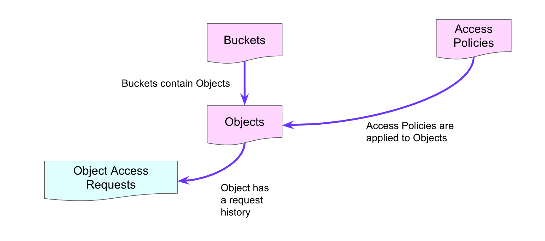 Now what about routine maintenance operations? With CockroachDB, they happen online. Below is a simple metadata example. We have an entity relationship diagram which shows 1) buckets 2) objects in those buckets we need access to 3) access rights to those buckets and 4) an object access request table for auditing access to the objects in the bucket.