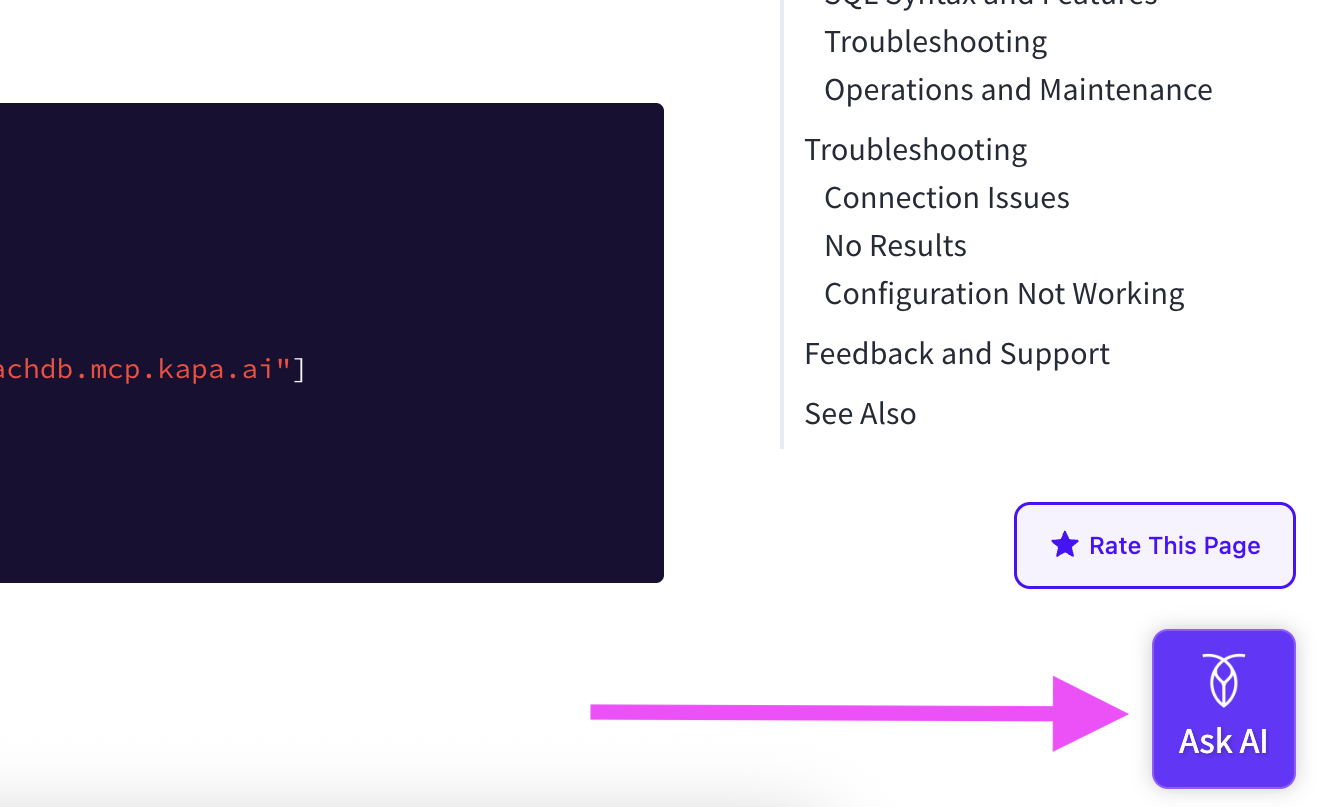 Click the “Ask AI” Widget on the bottom left of any page on the CockroachDB Documentation Site.