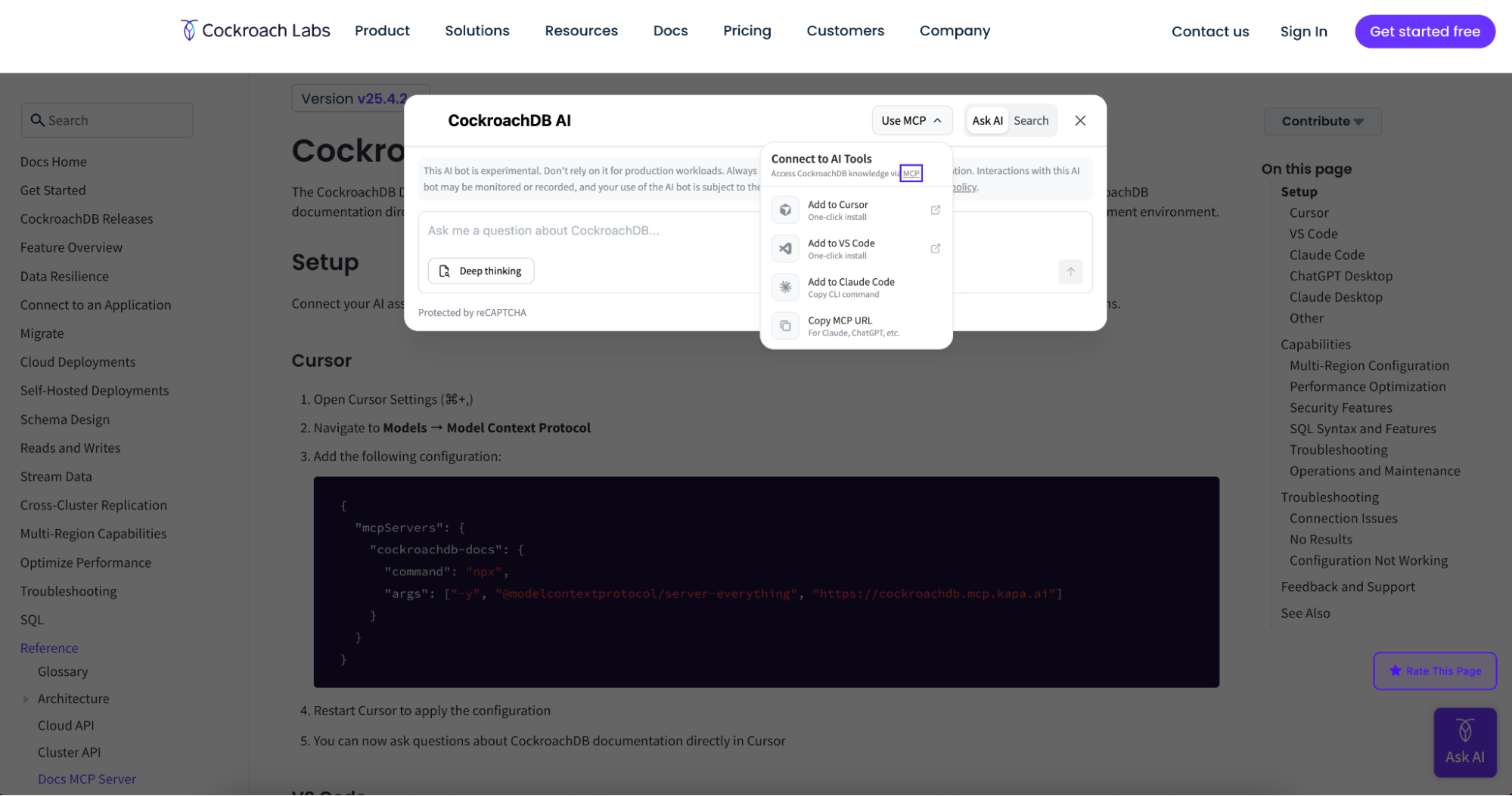 The CockroachDB Documentation MCP Server is available now from the docs page. The Quick Start setup takes just a few minutes: