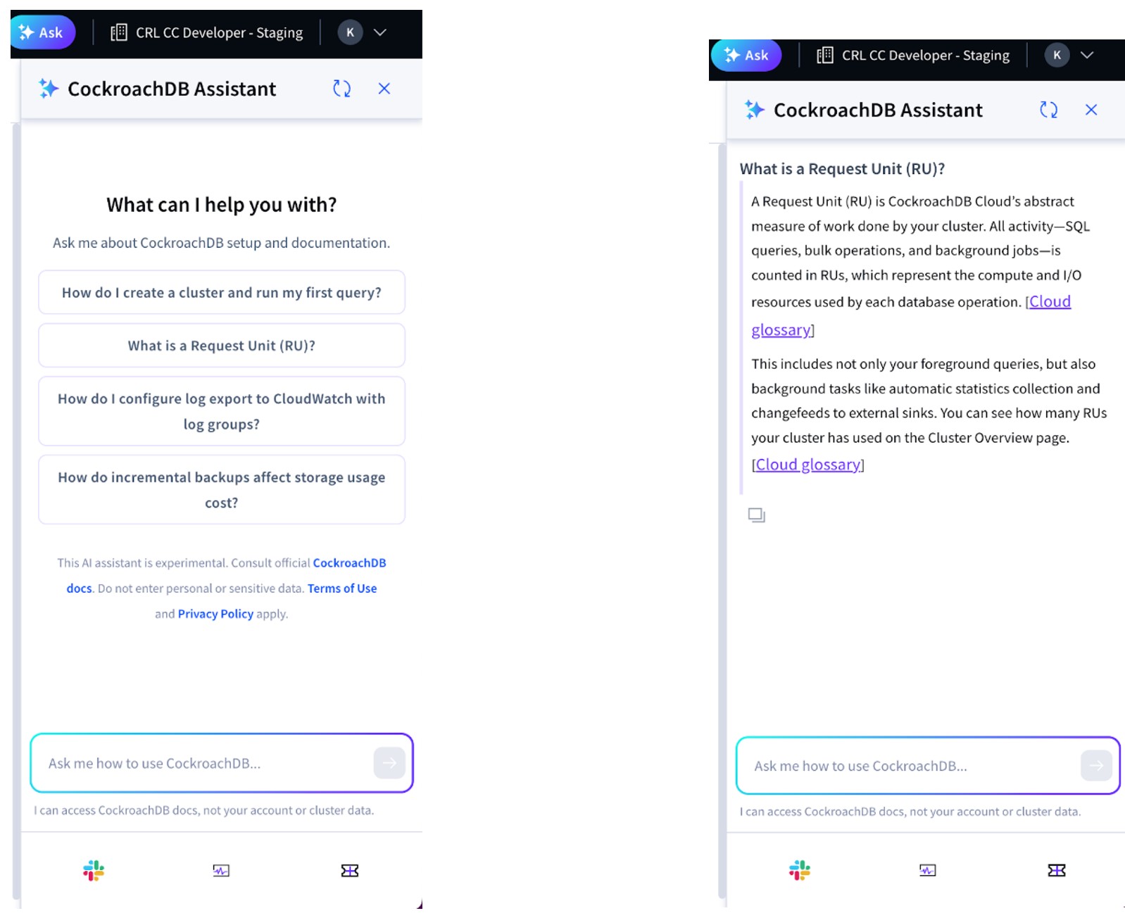 AskAI in the CockroachDB Cloud Console, for in-product help while you’re actively using CockroachDB in the cloud