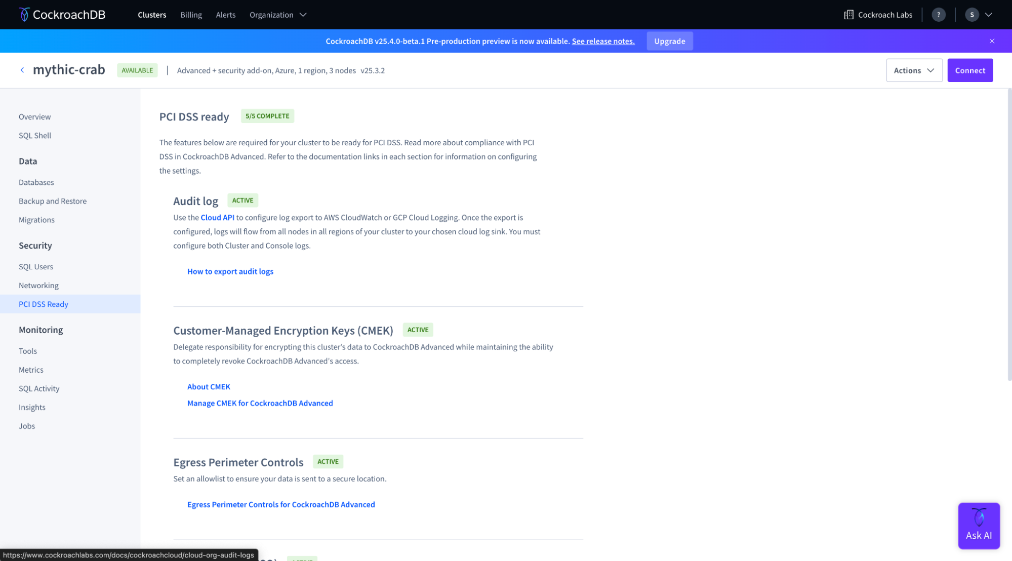 How does CockroachDB support PCI compliance? CockroachDB helps organizations meet PCI DSS requirements through strong encryption, network isolation, and auditable access controls. With Customer-Managed Encryption Keys (CMEK) and Egress Perimeter Controls on Azure, customers maintain exclusive control of key management and outbound data flow, ensuring that cardholder data remains protected and compliant across distributed environments.