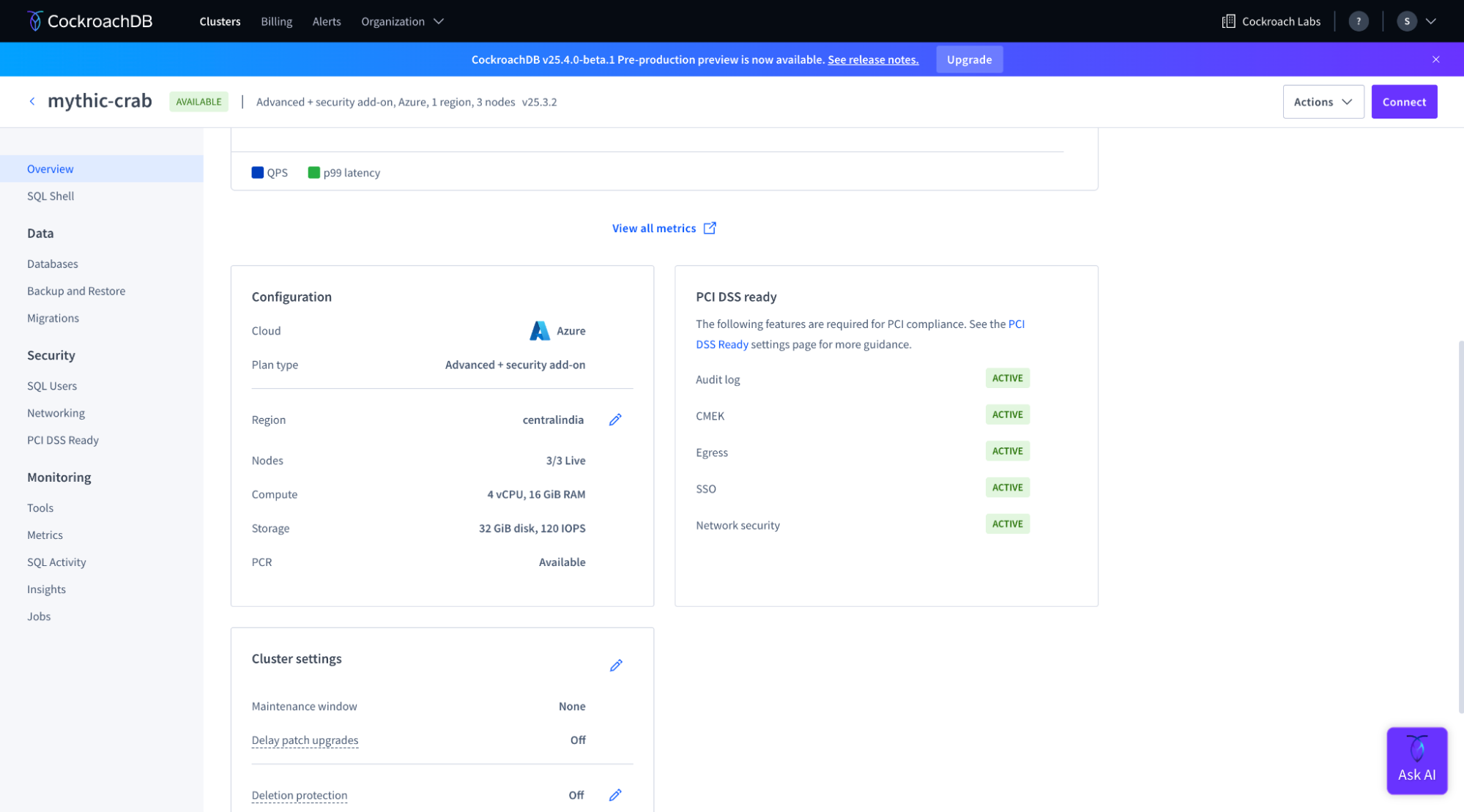 This feature is a critical enabler for organizations in highly regulated industries. With these new capabilities, now in private preview as part of CockroachDB 25.3, CockroachDB Cloud on Azure is positioned to meet the strictest requirements for HIPAA (Health Insurance Portability and Accountability Act) and PCI DSS (Payment Card Industry Data Security Standard) compliance. Data architects can now build massively scalable, resilient applications on Azure with the confidence that your data is protected by controls that you manage, satisfying both your internal governance policies and external regulatory mandates.
