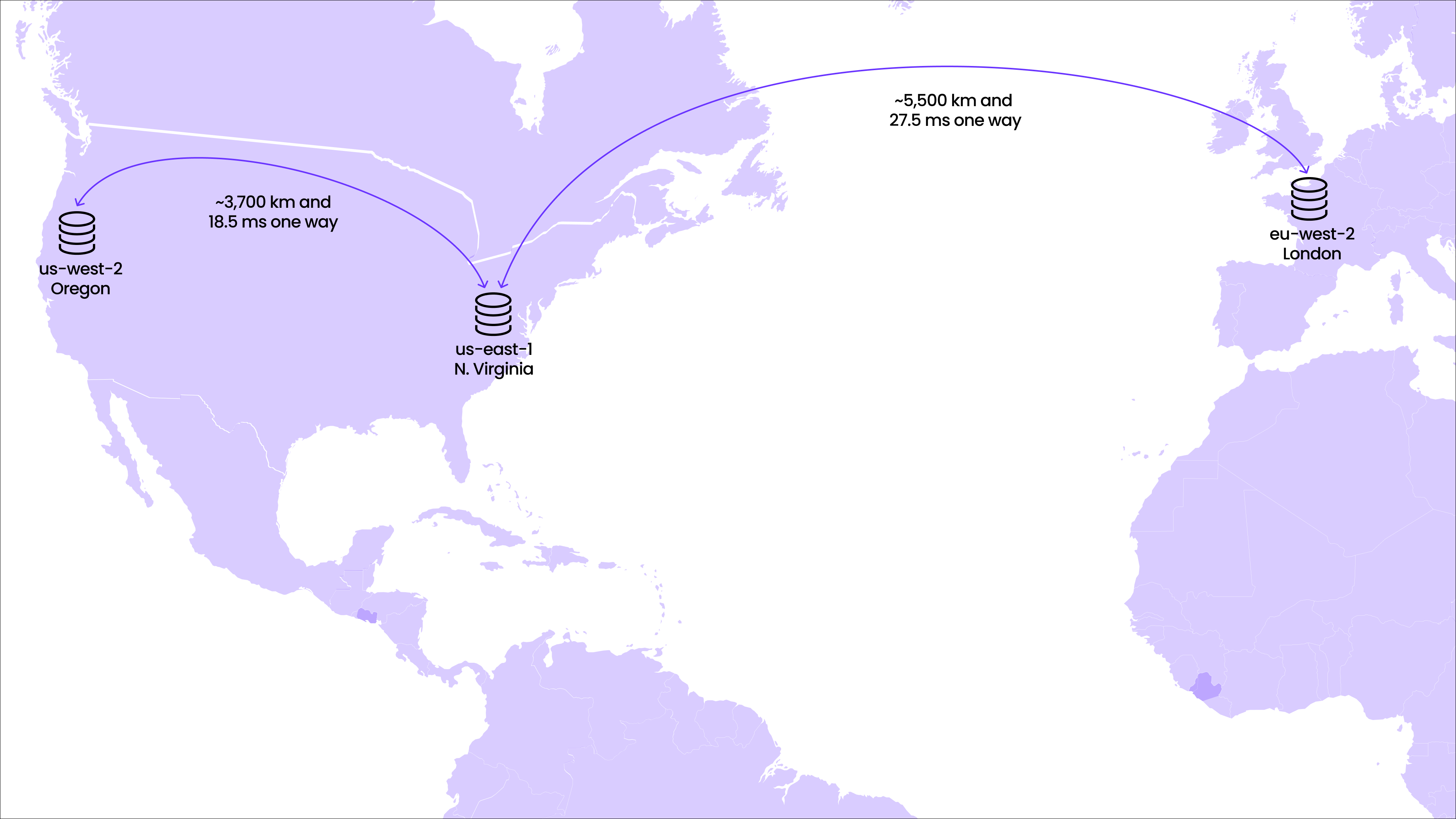 Consider the distance between major cloud regions. The distance from Northern Virginia to Oregon is approximately 3,700 km. At the speed of light in fiber, a signal takes at least 18.5 ms to traverse this distance one way. A round-trip communication requires a minimum of 37 ms, and this assumes a perfectly direct fiber path with no routing overhead, switching delays, or other real-world impediments.