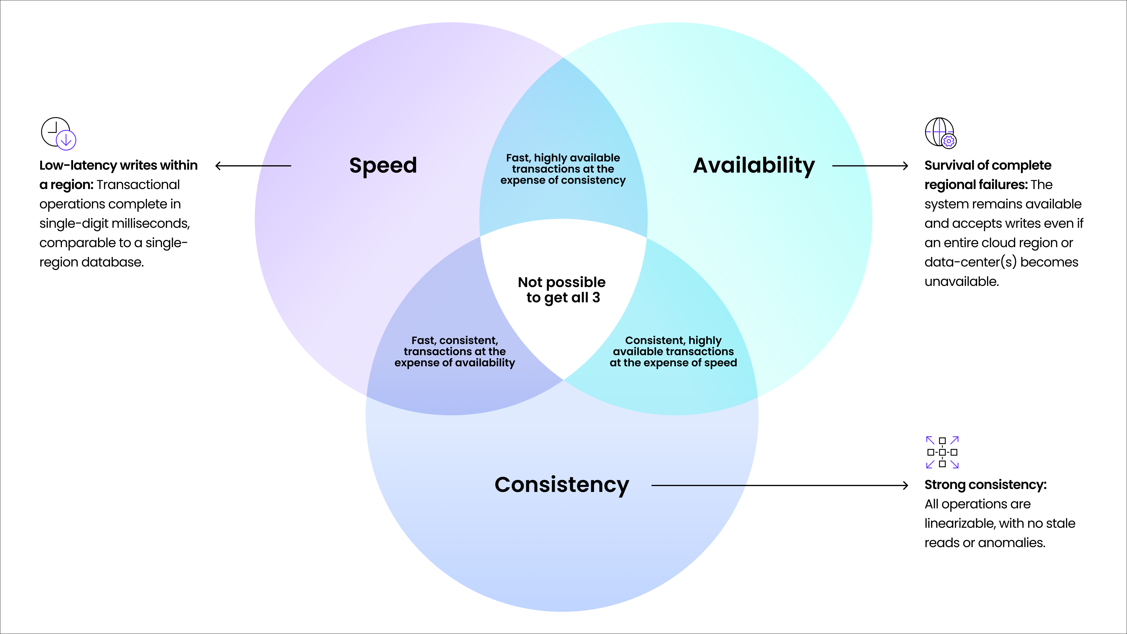 You can achieve any two of these properties, but not all three simultaneously. This is not a limitation of any particular database system. It is a consequence of the mathematics of distributed consensus combined with the physics of communication.