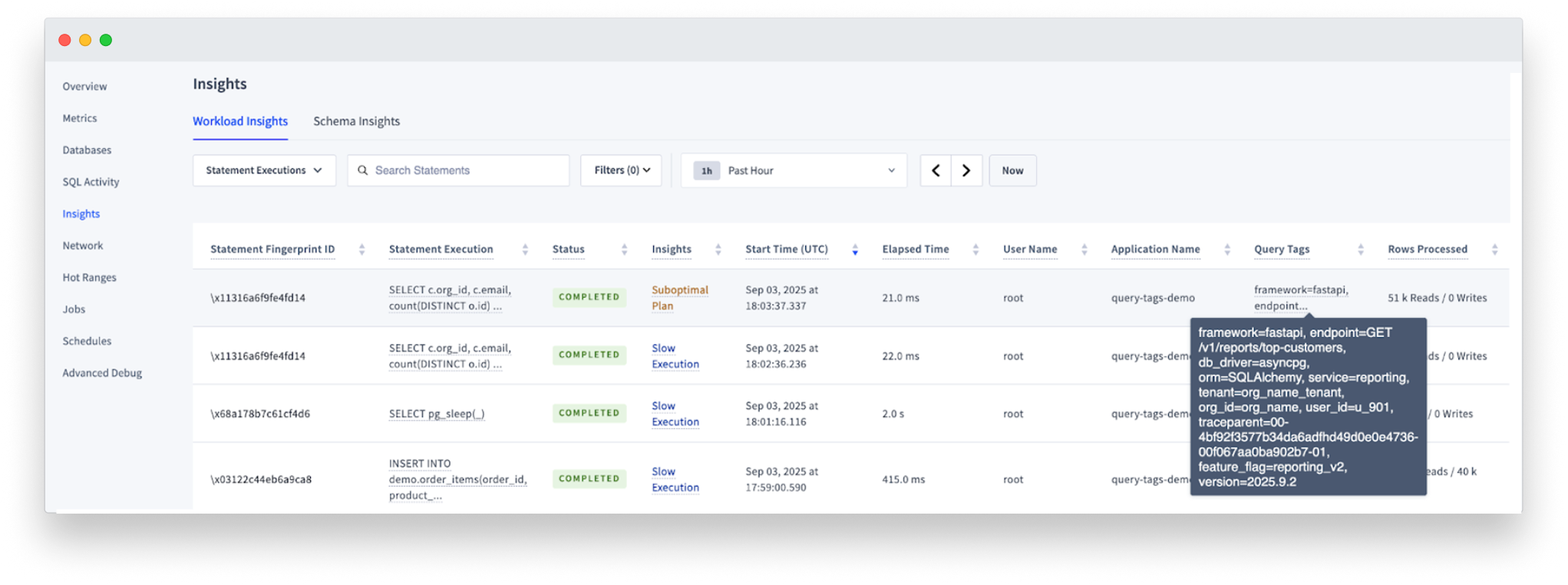 Console – The Statement Insights view includes a “Query Tags” column, making it easy to identify problematic queries by tag instead of raw SQL text.