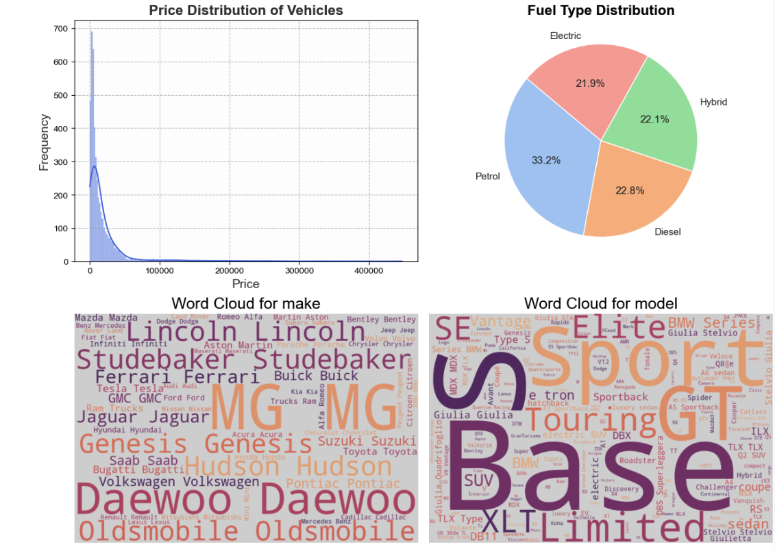 Price Distribution: A histogram shows the price spread, likely right-skewed with a long tail of luxury vehicles.