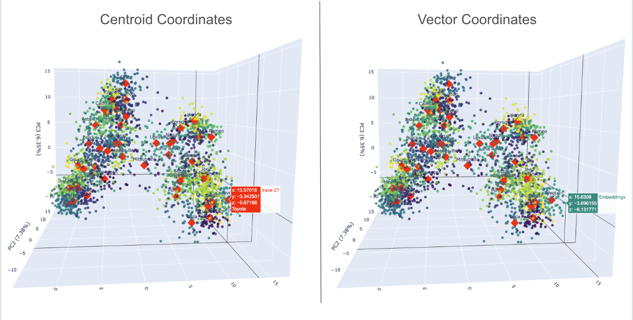 In the interactive plot provided, visually similar vehicles are naturally grouped together. The red diamonds, highlighted on the left side of the figure above, represent the centroids, such as the coordinates for Toyota. The right side of the figure displays the vector coordinates (a car image) corresponding to a selected embedding.