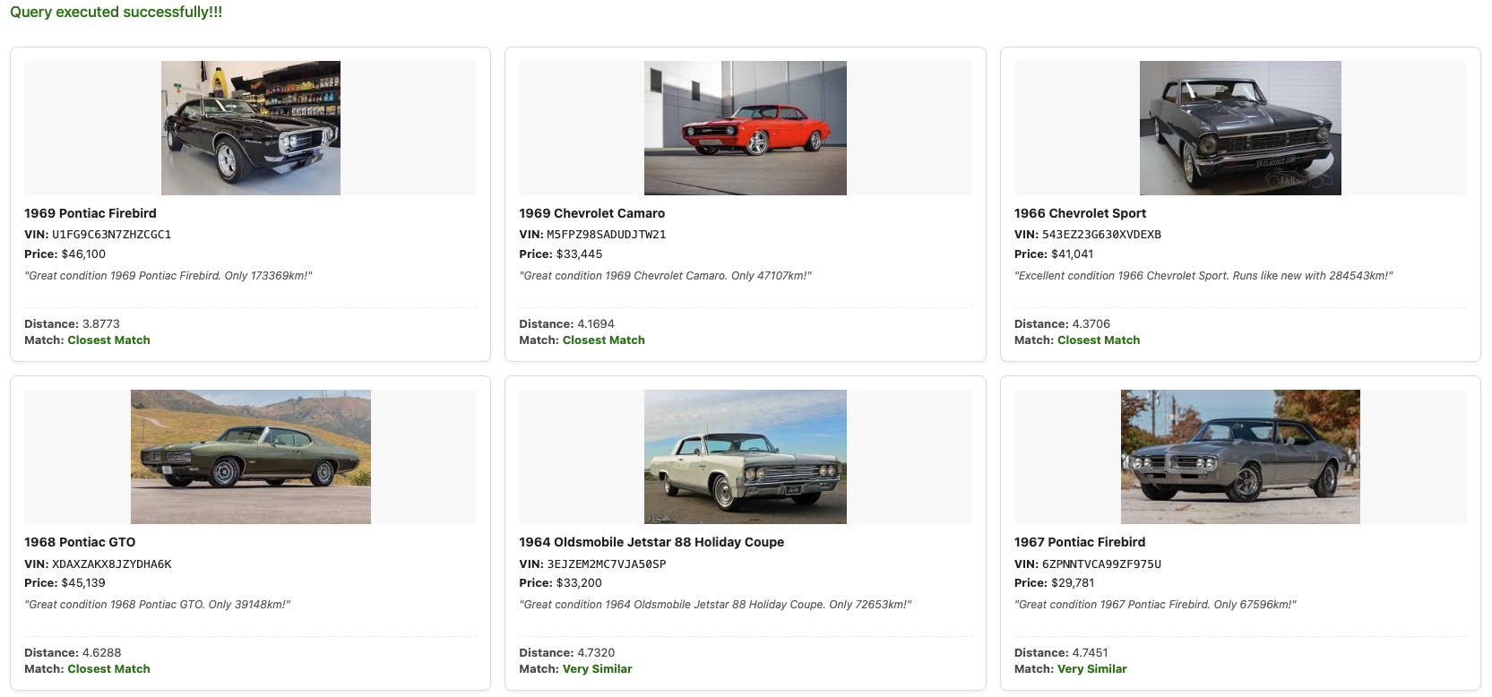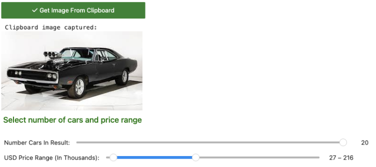 Time to talk about the main attraction: finding a car just from a picture! This is the cool part. There is no need to sift through lists, hoping the seller provided the right keywords in their description, like "vintage muscle" or "street racer." Just paste the photo, the app turns it into a vector, and then asks CockroachDB to find the most similar cars.