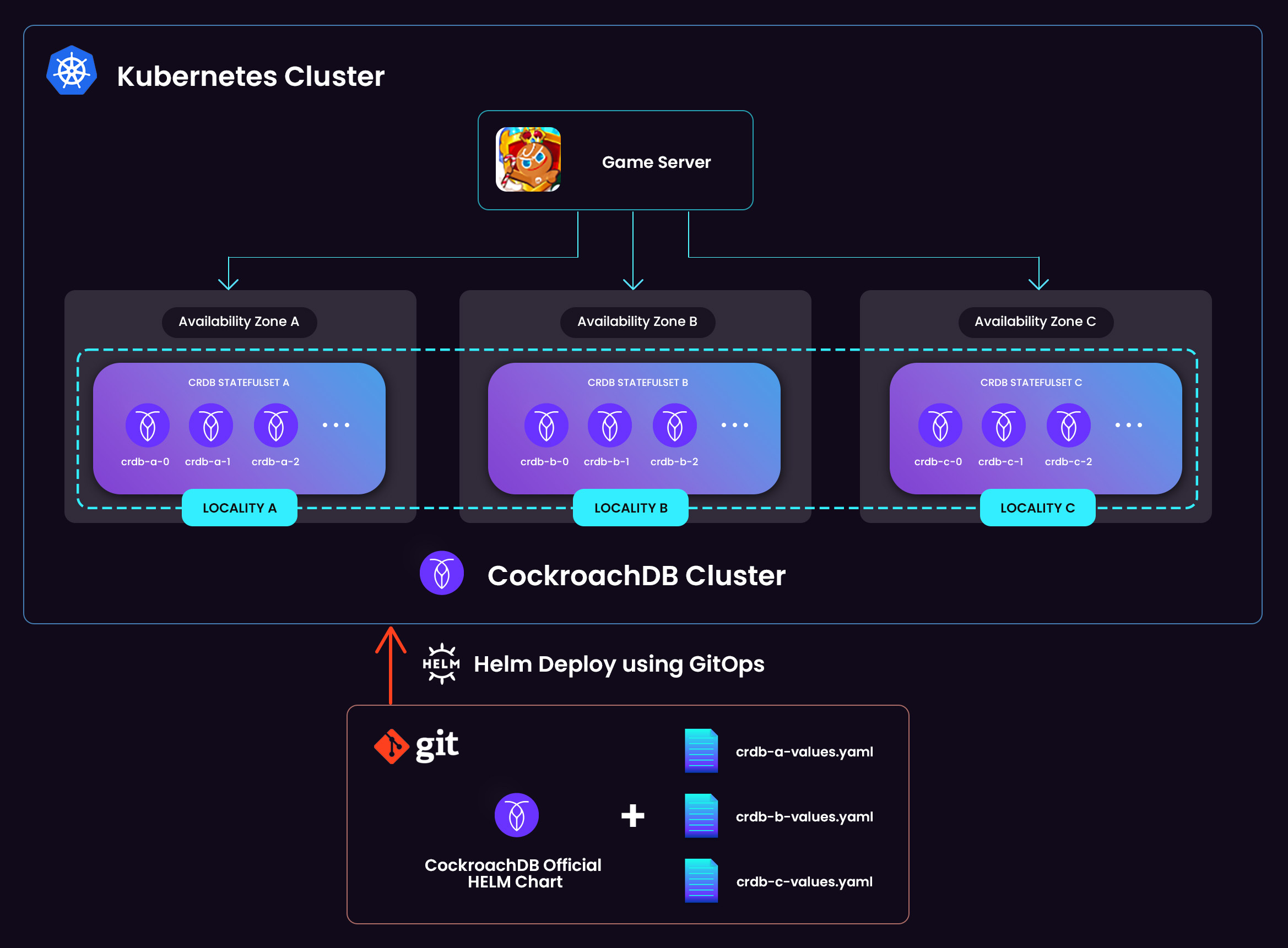 Here’s how it works: they deploy a CockroachDB cluster in a Kubernetes cluster on AWS EKS, and use the Helm chart for CockroachDB in Kubernetes. Their CockroachDB cluster consists of 3 localities for each available zone, and each locality statefulset corresponds to one Helm release. The CockroachDB Helm chart is deployed in an automated CD pipeline with GitOps. There’s a total of 90 nodes split across a single region, multi-availability zone deployment.