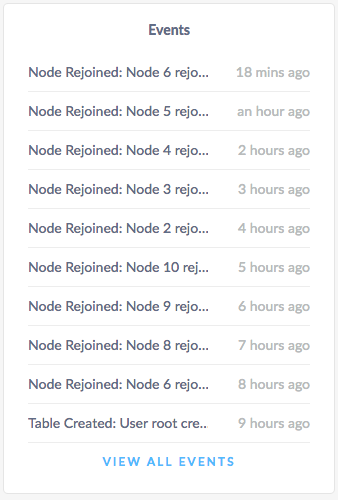 The Cluster Metrics dashboards display the Events panel that lists the 10 most recent events logged for the all nodes across the cluster. To view the Events panel, click Metrics on the left-hand navigation bar. To see the list of all events, click View all events in the Events panel.