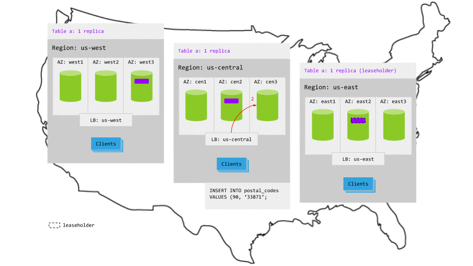 Assuming you have a cluster deployed across three regions and a table like the following:
